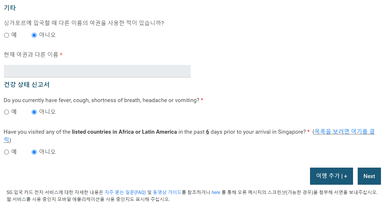 개인정보의 경우 싱가포르 도착(입국) 3일 전부터 작성이 가능합니다. 사실 입국 날짜가 딱 3일까지만 선택지로 노출되기 때문에 이 시기에 맞춰서 반드시 작성하여야 합니다!