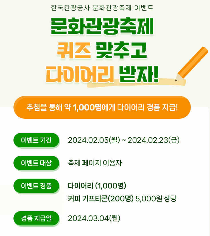 바로 대한민국 구석구석이라는 사이트인데요. 의외로 많이들 모르고 계시지만, 마침 이벤트로 '문화관광축제 퀴즈 맞추고 다이어리 받자'를 진행하고 있으니, 이왕 오신 김에 무료 다이어리와 커피쿠폰 받아가시기 바랍니다. 10초면 맞출 수 있고, 홈페이지만 방문해서 쓱- 둘러본다면 정답도 어렵지 않게 맞출 수 있습니다.